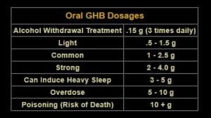 Cada mililitro (unidad de volumen en líquido) de GBL, produce en el cuerpo 1.6 gramos de GHB. Así, dosis entre 1 y 2 ml de GBL (1.6-3.2 gr de GHB) se encuentran dentro de un rango razonablemente seguro (1). Pero al doblar la dosis ( 5 ml de GBL= 8 gramos de GHB) entramos de lleno en la dosis tóxica (2). Dosis de 10 gramos de GHB pueden ser mortales (3).