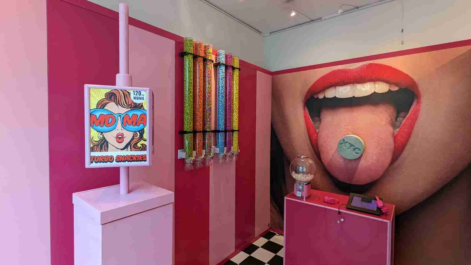 El primer modelo se asemeja a una tienda de dulces exagerada, con un arcoíris de dispensadores de pastillas montados en la pared, promociones visuales llamativas y tu pastilla (en este caso solo una menta) entregada a través de un dispensador tipo máquina de chicles una vez que has completado un breve cuestionario en iPad.